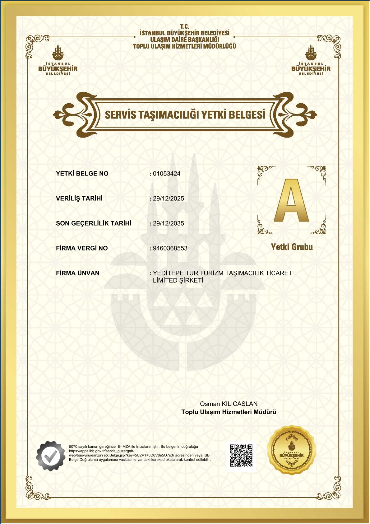 • İstanbul Büyükşehir Belediyesi tarafından verilen Servis Taşımacılığı Yetki Belgesi