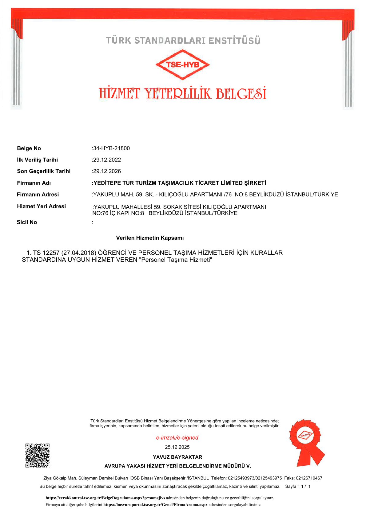 • TSE-HYB 12257 – Hizmet Yeterlilik Belgesi