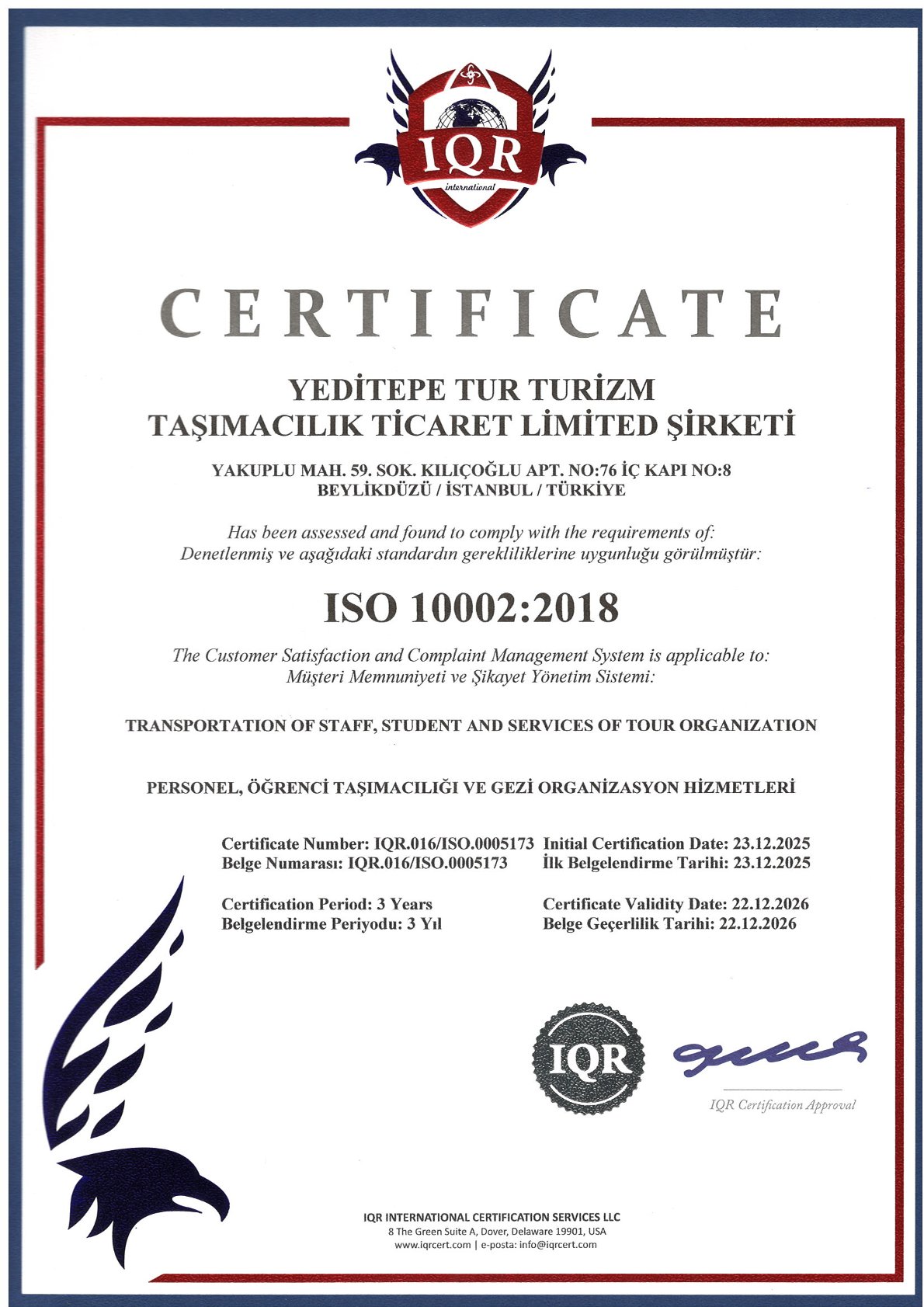 Yüksek hizmet kalitesini ve güvenliği temel ilke edinen Yeditepe Tur Turizm, çeşitli denetimlerden başarıyla geçerek şu sertifikalara sahiptir: