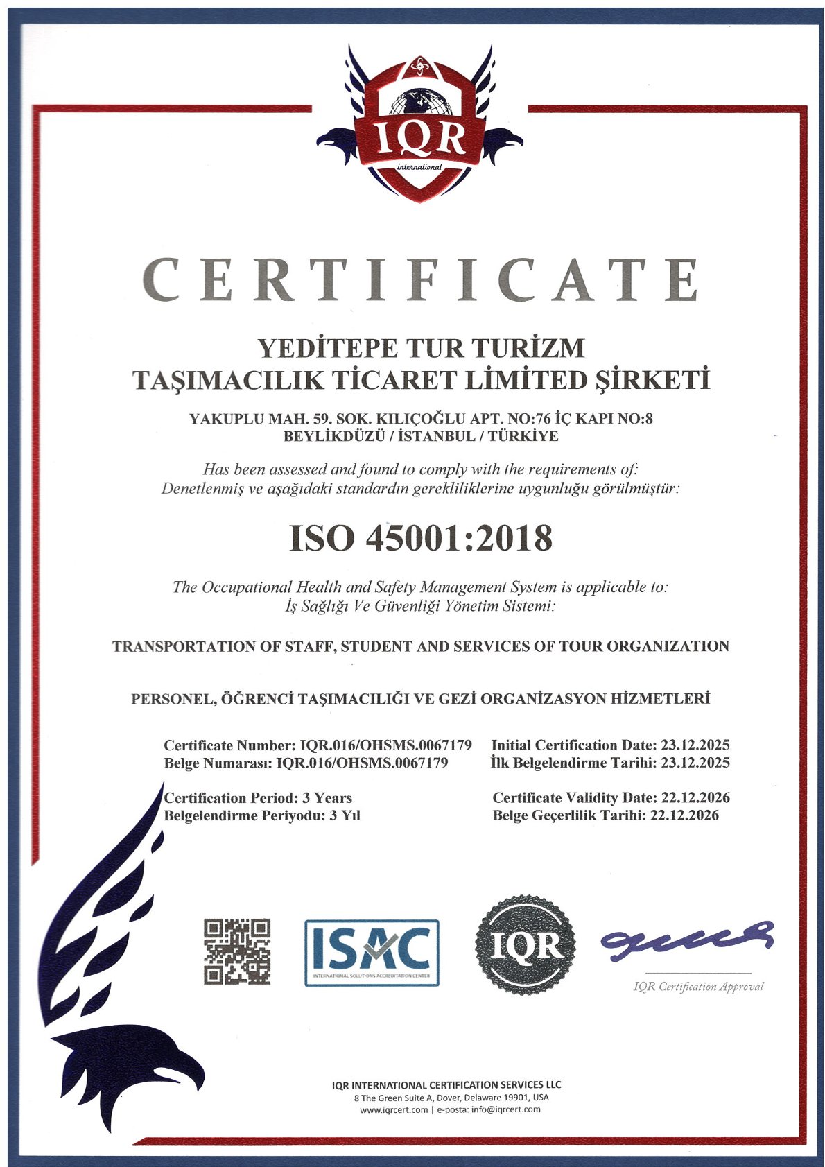 • ISO 45001:2018 – İş Sağlığı ve Güvenliği Yönetim Sistemi Belgesi