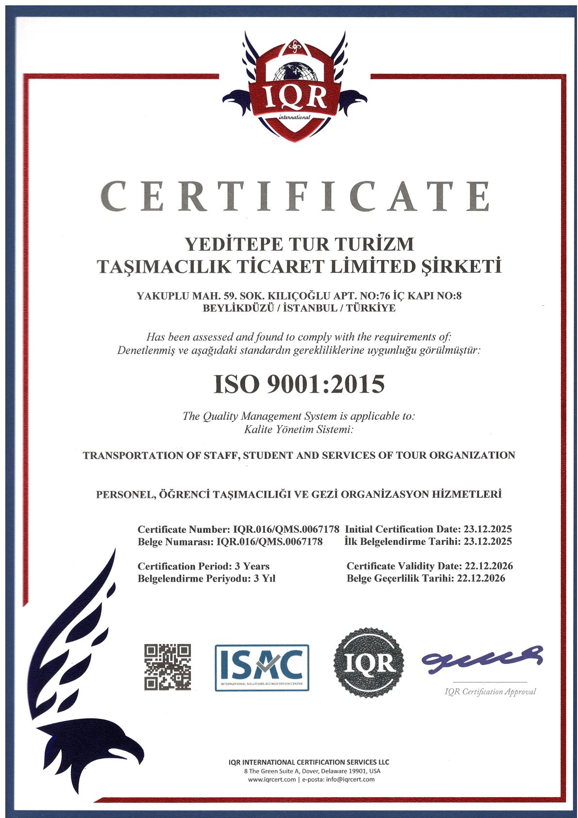 • ISO 9001:2015 – Kalite Yönetim Sistemi Belgesi